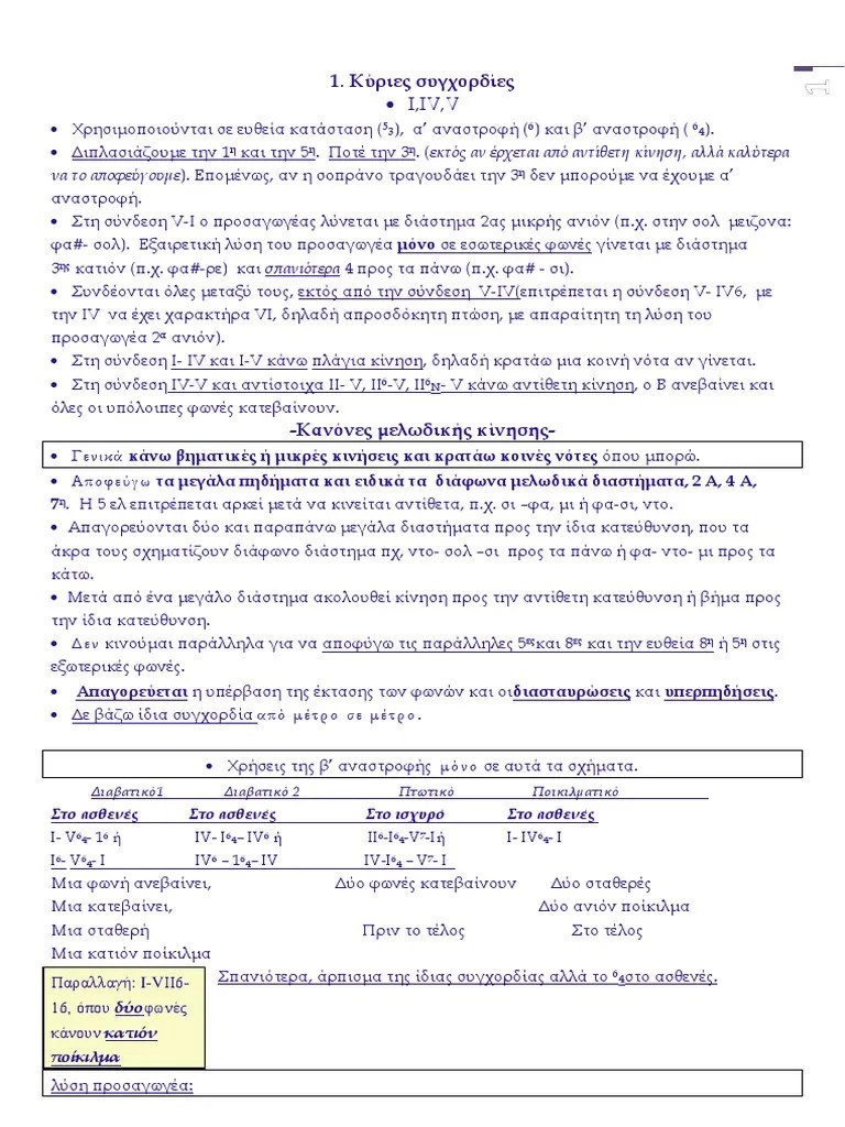 Να λύσεις τουλάχιστον 2 από τα παραπάνω θέματα. Σύνολο των σχέσεων µεταξύ των συγχορδιών ενός τονικού χώρου µε άξονα το. Η ναπολιτάνικη συγχορδία και τα παράγωγά της στο μείζονα και στον ελάσσονα τρόπο. Αλλοίωση της 4ης, στον ελάσσονα, προς τα πάνω; ▫ παράλληλες 5ες του mozart. Φωνης συγχορδίας επί της βαρυμένης ιι βαθμιδας «με διπλασιασμένη. (η συγχορδία της τονικής σε θέση 8ης , 3ης ή. Ναπολιτάνικη συγχορδία (sn), την ηµιελαττωµένη έβδοµη (sd7), την. • γραφή ή/και αρίθμηση ή/και ορθή σύνδεση συγχορδιών. (σε ευθεία κατάσταση και σε αναστροφές). Γράφεται όμως και σε ευθεία κατάσταση με διπλασιασμένη την . Συγχορδιών σε ευθεία κατάσταση και αναστροφές σε αρπισμούς, η ικανότητα αναγνώρισης. Mια συγχορδία λέγεται αλλοιωμένη όταν κάποια ή κάποιες από τις νότες που την.